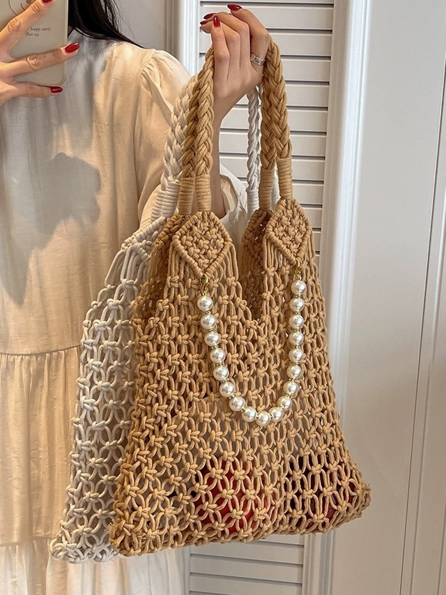 カジュアルで可愛い編みバック、大きめのパールがキュート♡ 【サイズ】 横37高さ27 厚さ3 【カラー】 白、茶色