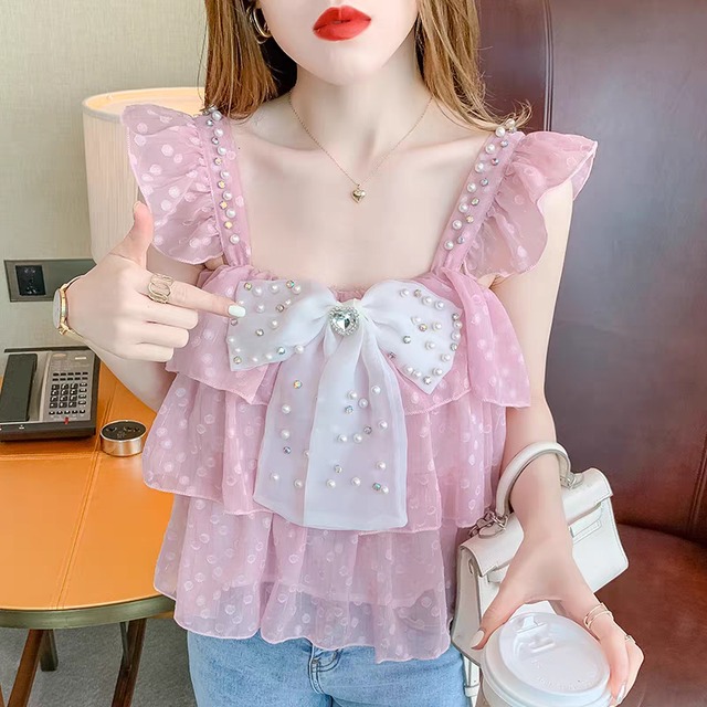 韓国夏新作♡ 大きなリボンと、キラキラなスタッズが可愛いひらひらトップス♡ 【カラー】 白、ピンク、ブルー 【サイズ】 S M L XL 着丈 バスト S 58 90 M 59 94 L 60 98 XL 61 102