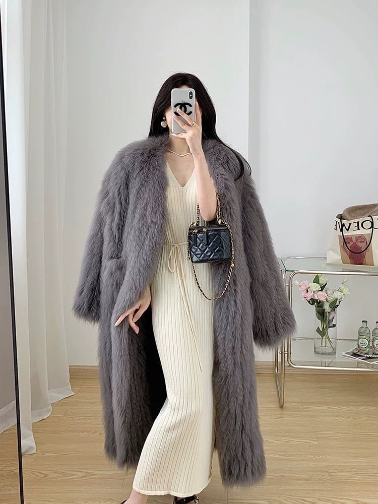 柔らかいファー素材のロングコート、エレガントでカジュアルなスタイルに最適。