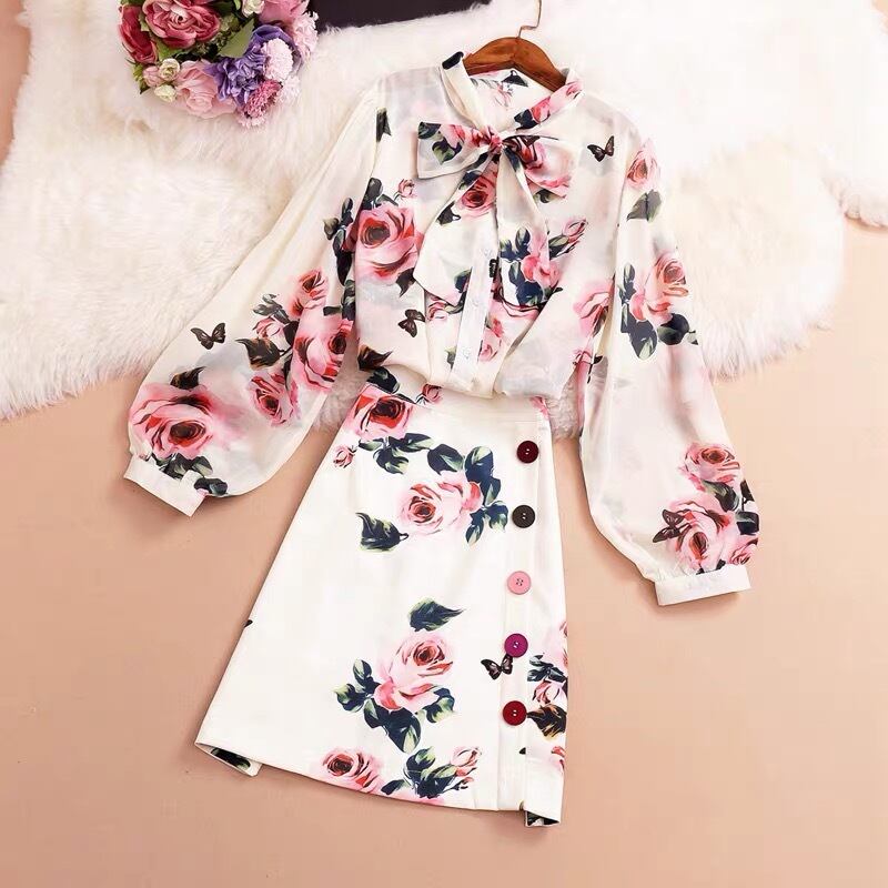 薔薇柄シフォンシャツトップ + ハイウエストボタンスカートセット