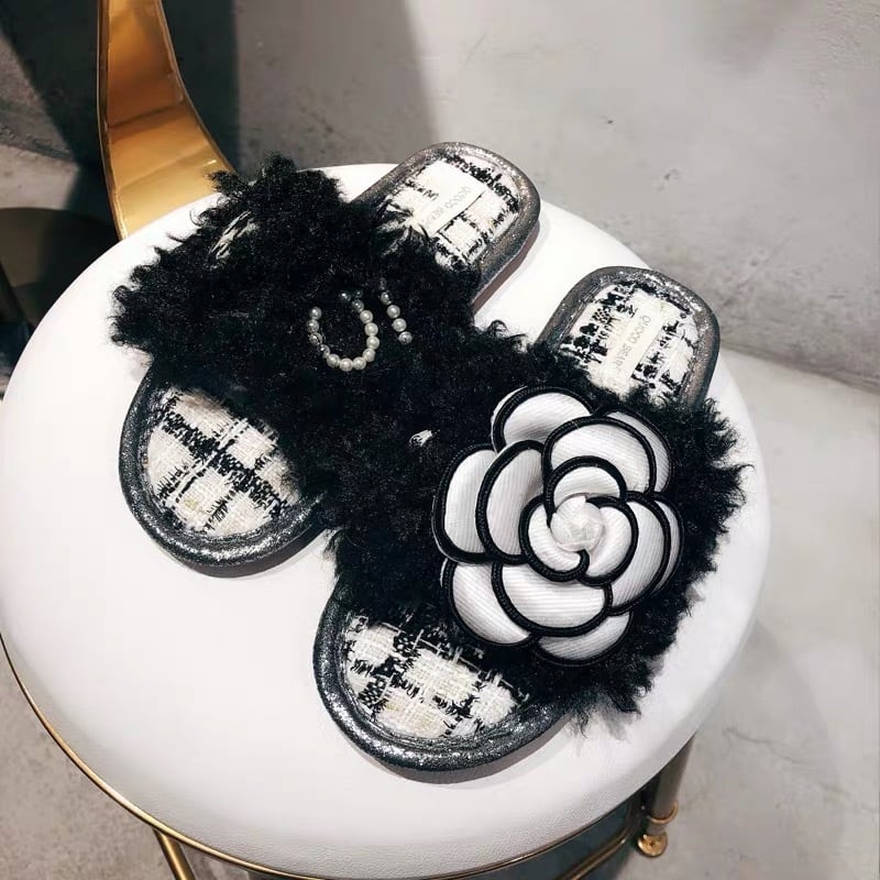 大人気カメリアデザインのファー付きサンダル♪