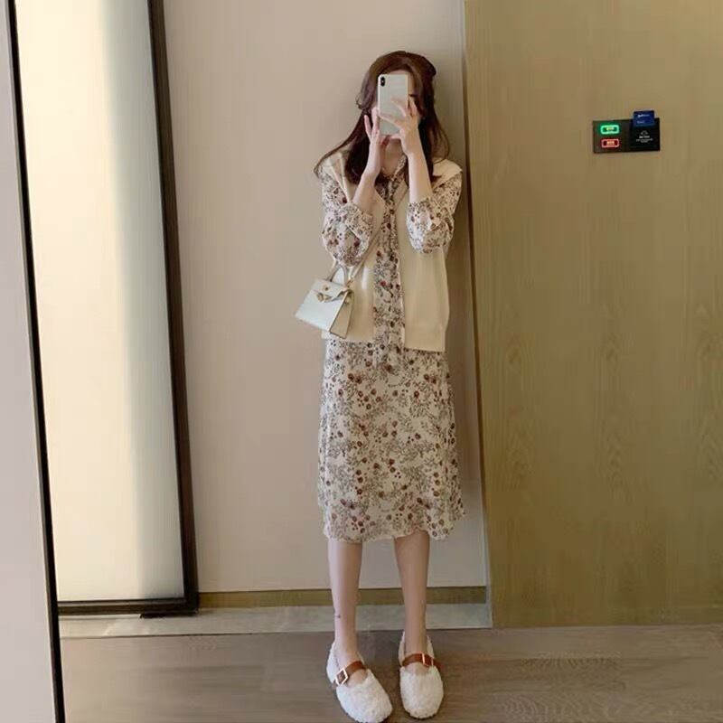 ニットベスト+花柄春ワンピースのセットコーデ♬