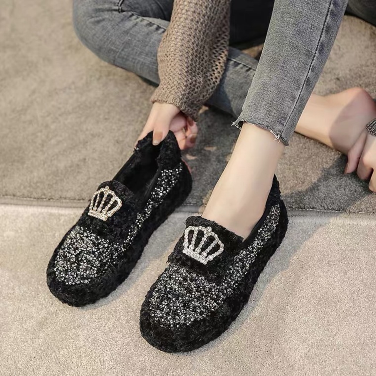 キラキラの王冠が可愛らしく、もこもこ暖かで寒いこれからの季節にピッタリのシューズ!!