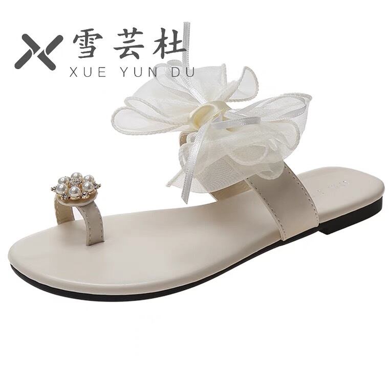 ふわふわのレースのリボン!!親指にキラキラのビージュが可愛い、フラットサンダル♪
