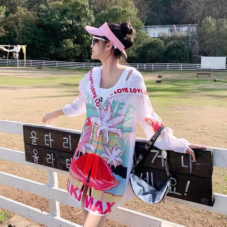 フラミンゴとカラフルなデザインが可愛らしい、薄手の涼しいパーカー、日焼けカバーとして着るにも涼しくお勧め⭐︎