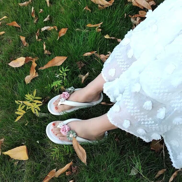 お花のコサージュが3色ついていて可愛らしい、フラットのサンダル!!足元楽チンでおすすめ⭐︎