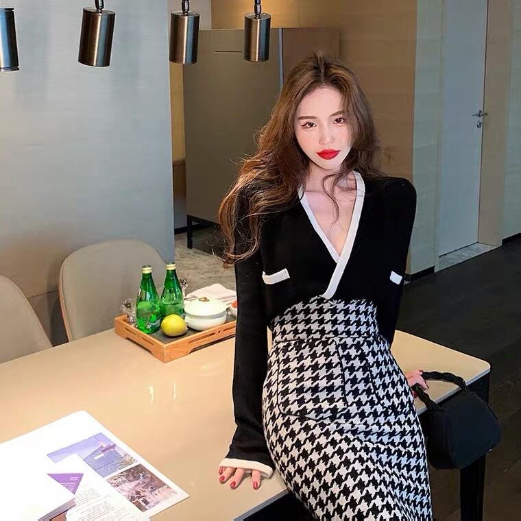 韓国スタイル、セクシーなニットトップスと千鳥柄の膝丈スカート!!