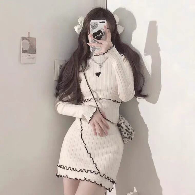 韓国デザイン、胸元のハートマークとフリフリのデザインがキュートなミニタイトワンピース♡