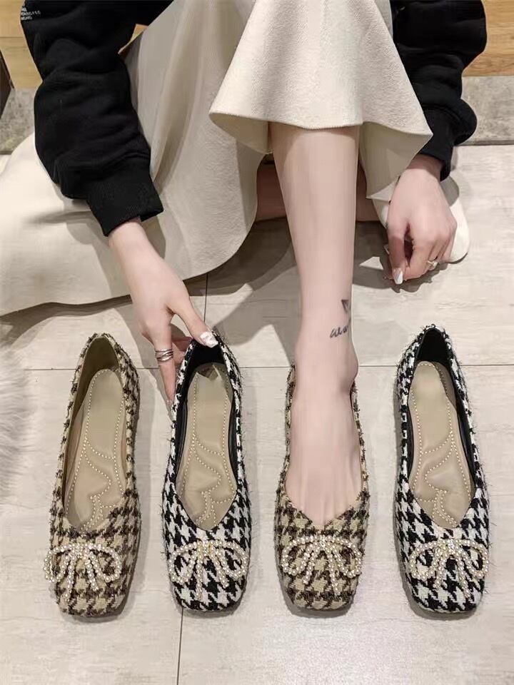 千鳥柄のレディースフラットパンプス、パールのリボンが可愛いワンポイント♪