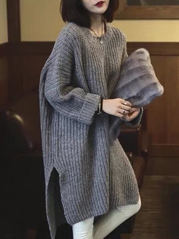 キレイめな形のロングニットセーター、大人の女性にぴったり♪カジュアルスタイル♪