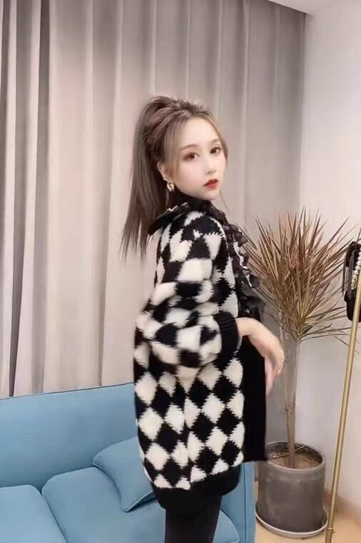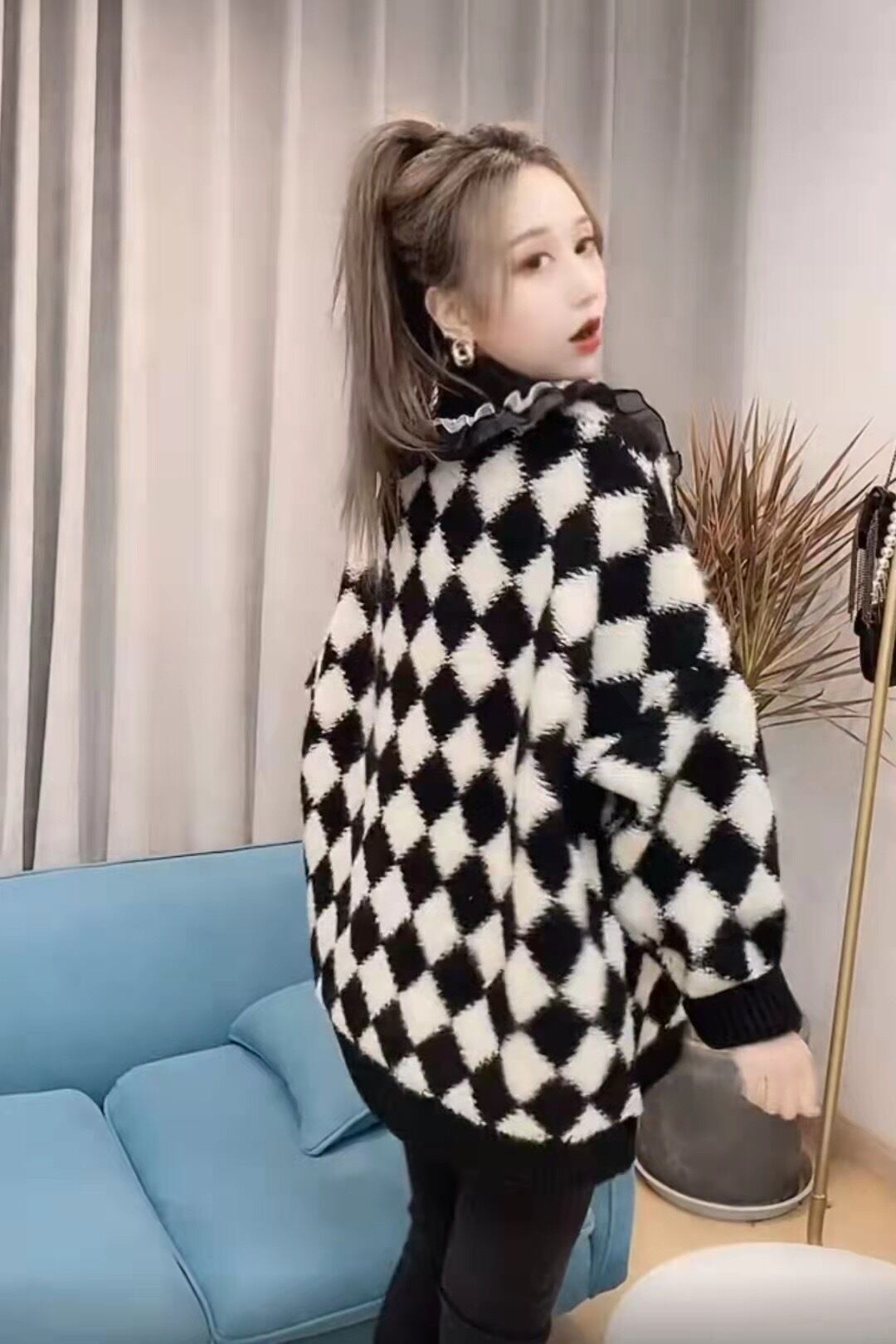 韓国Popなひし形デザインのニットカーディガン、襟元のフリルが可愛さ◎スカートにまジーンズにも合います♪