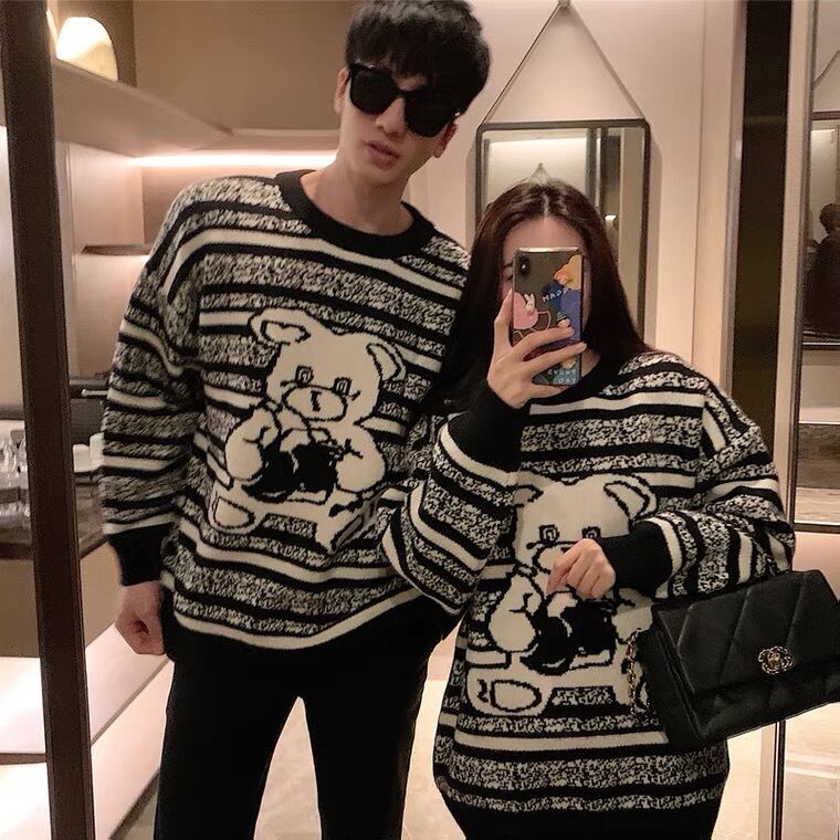 ストライプデザインでくまの絵柄がキュートな男女兼用ニットセーター♪
