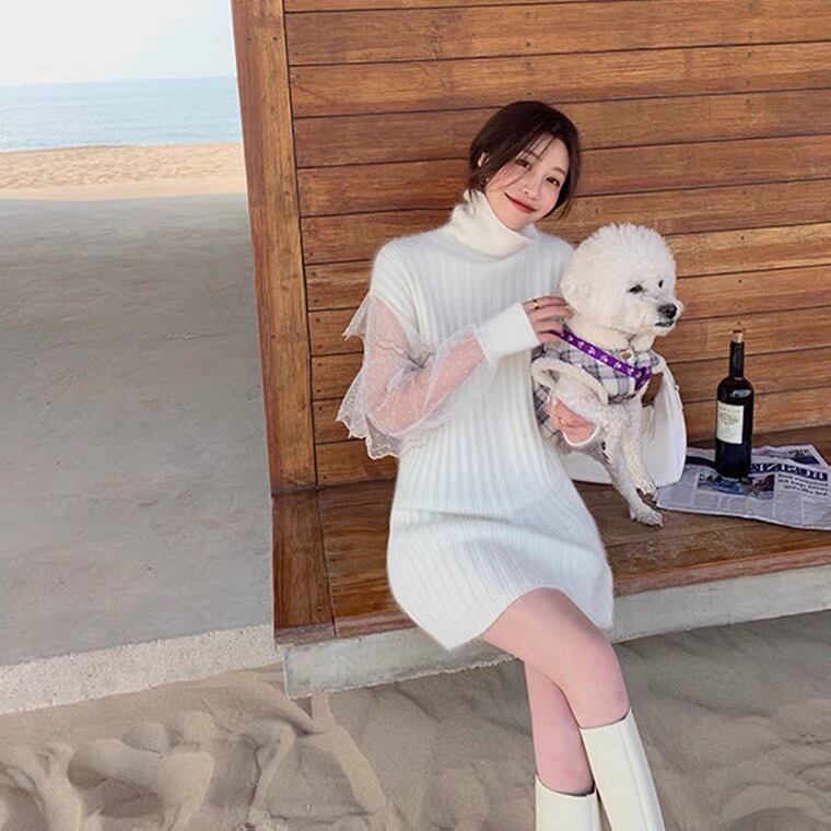 肩部分から透け感ありのレースがセクシーでふんわりとしたニット素材が可愛らしい韓国人気ワンピース♡タートルネックタイプになります。
