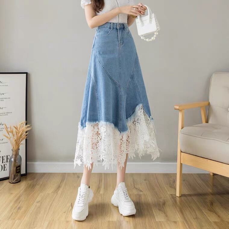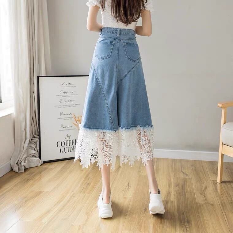 レース調のデザインが女性らしく可愛いデニムのスカート♡Tシャツなどに合わせてカジュアルにもブラウスと合わせてガーリチックにも◎